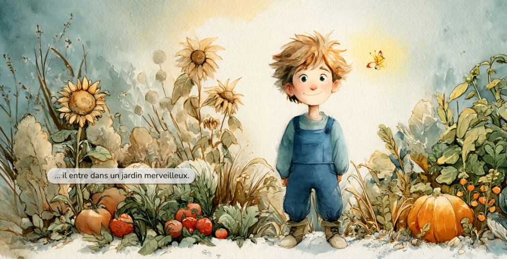 Sa curiosité l’emmène découvrir un jardin magique… et un secret que la nature gardait pour lui.