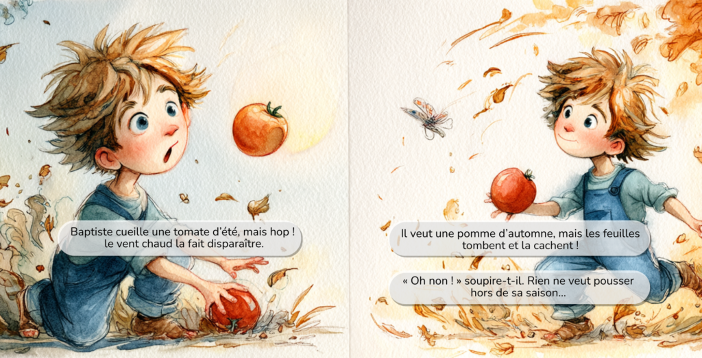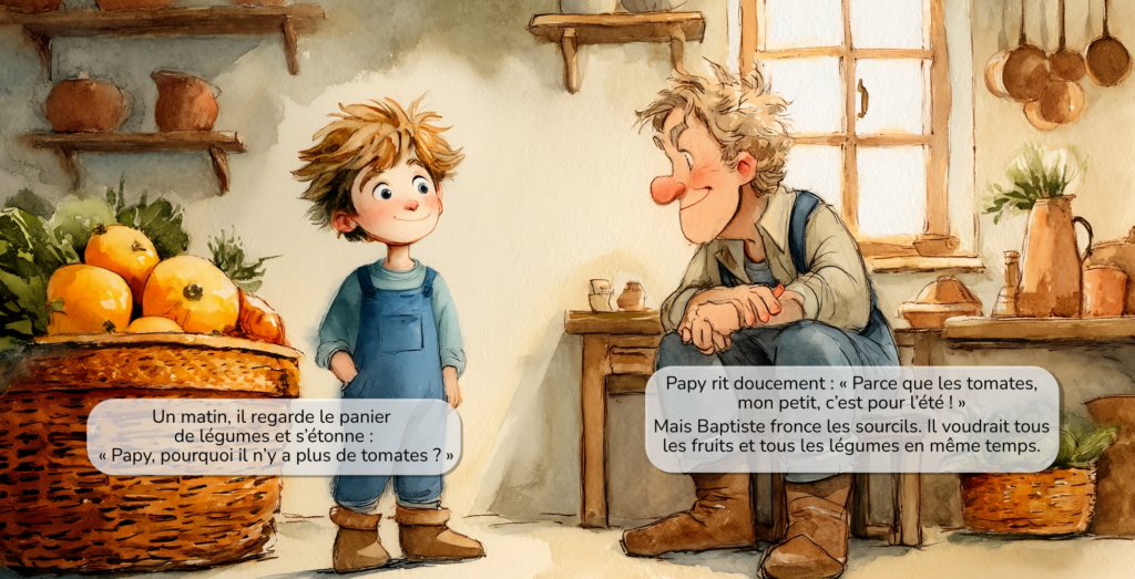 Baptiste adore les tomates. Alors quand il n’en trouve plus dans le panier, il veut comprendre pourquoi.
